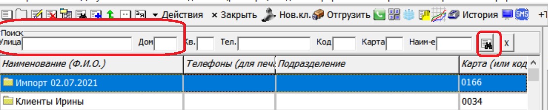 Найти клиента можно, набирая первые буквы наименования или фамилии, кроме того можно искать по улице и дому (нажимаем CTRL+У, вводим часть названия улицы, нажимаем Tab, вводим номер дома или сразу нажимаем Enter)