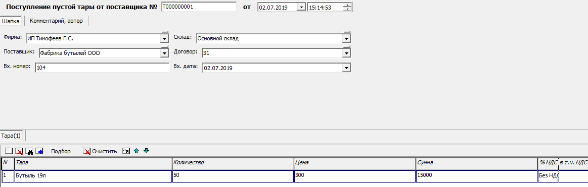 Перечисленная в документе тара по умолчанию поступает на склад (регистр «тара на складе»). В случае, если фактически пустая тара не поступала, а документ все-таки необходим, снимите флажок «проводить по складу».
