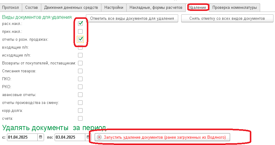 Открыв соответствующую вкладку, задаем этот период и нажимаем «запустить удаление документов». После подтверждения будут удалены документы за выбранный период с признаком загрузки (комментарием «###Загружено из Водяного»).