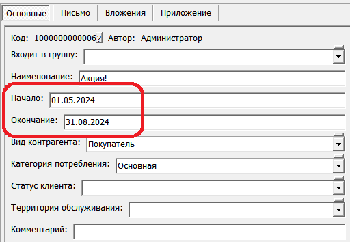 Чтобы в приложении отражались сведения об акции, надо создать запись в справочнике «маркетинг - рекламные кампании, рассылки».