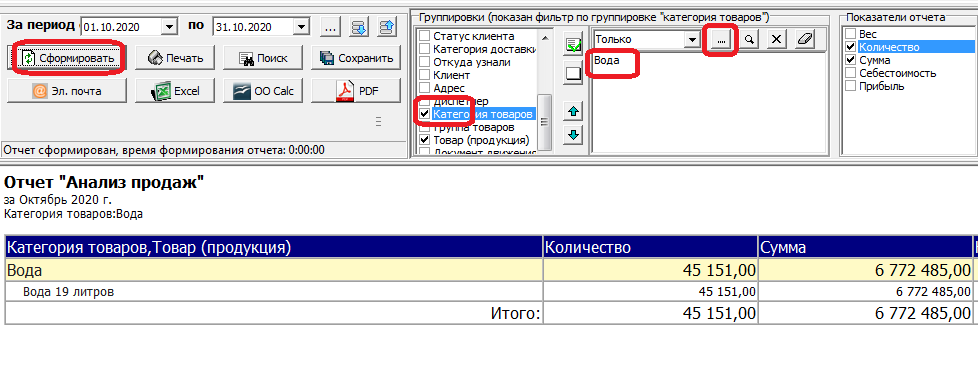 Основной отчет по продажам товаров, есть группировка по категории товаров (вода, оборудование, прочие).