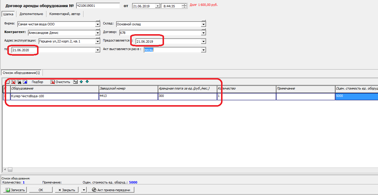 Отметив нужный адрес, нажимаем «ОК». В открывшемся окне задаем модель оборудования, заводской номер, арендную плату в месяц и оценочную стоимость (на случай порчи или утраты).В случае бесплатного пользования арендную плату не указываем.
