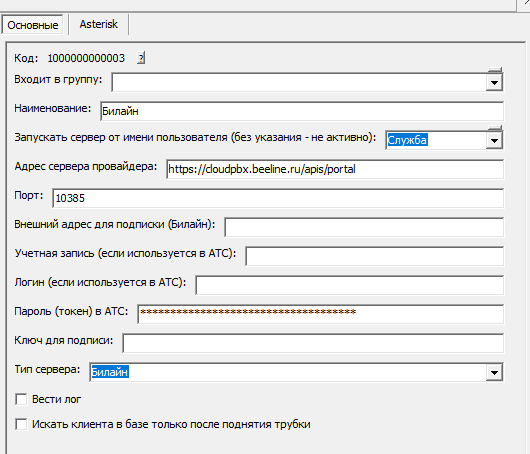 В создаем строку в справочнике «администрирование — облачные АТС», указываем в ней адрес сервера провайдера