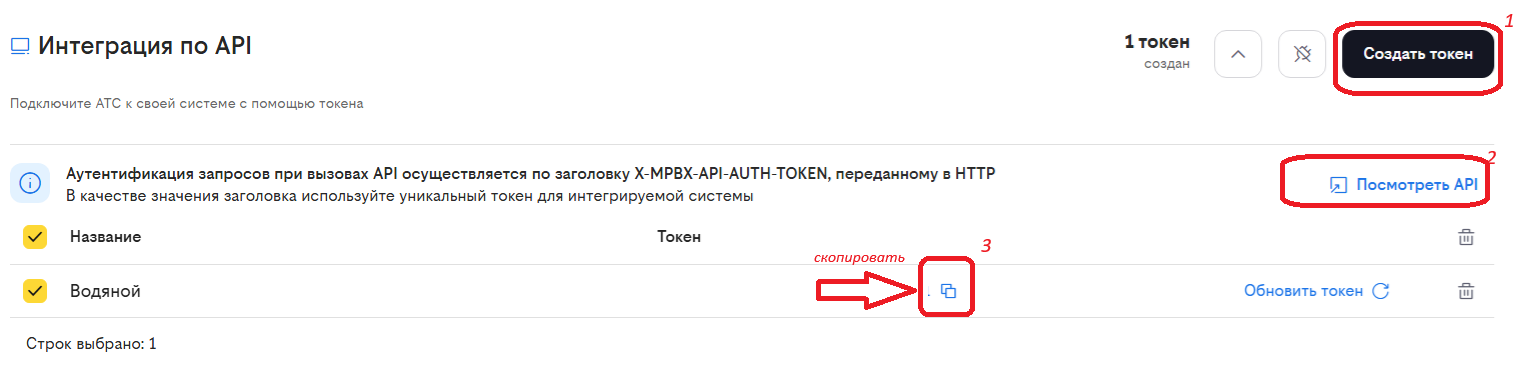Собственно значение токена (например, 8c0711c0-b11b-11fd-b111-111a111d18e1) скопировать и вставить в Водяном в соответствующее поле справочника облачных АТС.
