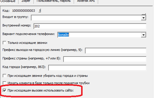 Если Водяной работает локально, не на терминальном сервере и на компьютере установлена программа для звонков (софтфон), установите флажок «при исходящем вызове использовать callto:».