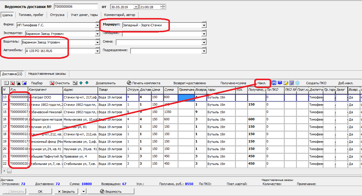 В особых случаях (водитель без задания заехал к клиенту и забрал тару) можно добавить строки, не связанные с продажей товара, вручную, не забывая заполнить поля тары, фирмы, договора, но это нестандартная и нежелательная схема работы.