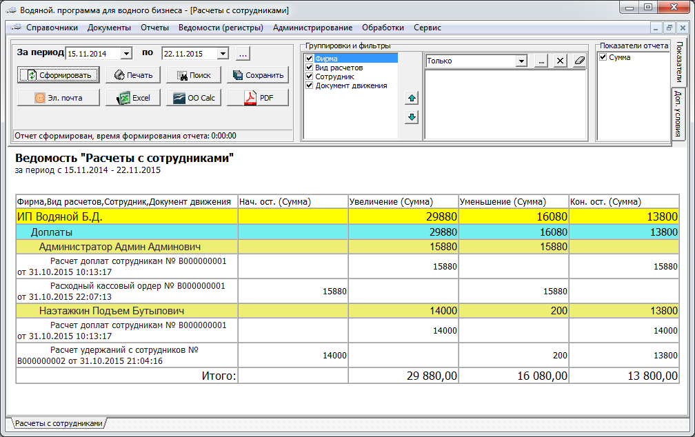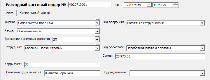 В приведенном примере первому сотруднику начислено и выдано расходным ордером 15880 руб., а второму начислено 14 тыс., а 200 рублей вычтено за нарушения в работе, оставшаяся сумма в 13800 руб. пока не выплачена.