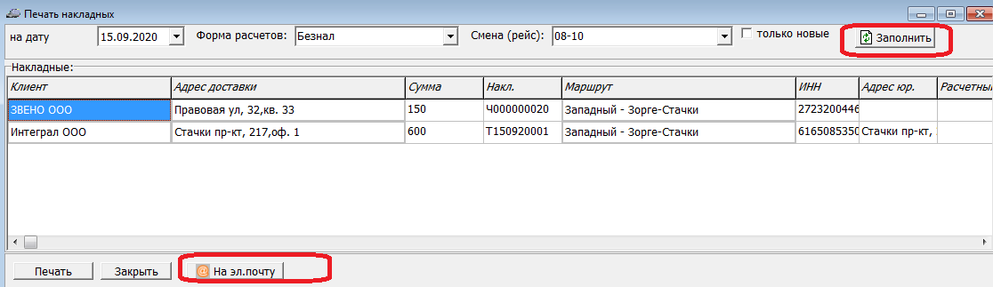 Отправка всех накладных за смену с отбором по форме расчетов