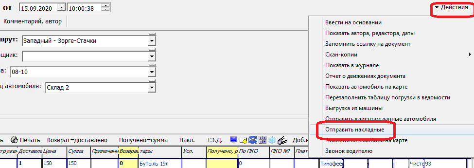 Функция отправки накладных с факсимиле на эл. почту из ведомости доставки находится в меню «действия». Кроме печатных форм, будет выслана информация о машине и водителе.