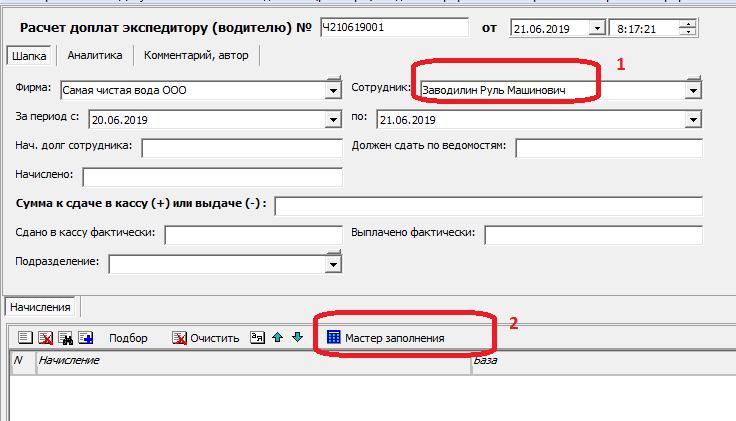 Программа заполнит период, указав начальную дату - следующий день после предыдущего расчета. При первом вводе начальная дата будет в 1899 году, это нормально. В случае, если есть сальдо расчетов с водителем (например, в прошлый раз ему выдан аванс), оно будет показано в поле «нач. долг сотрудника».