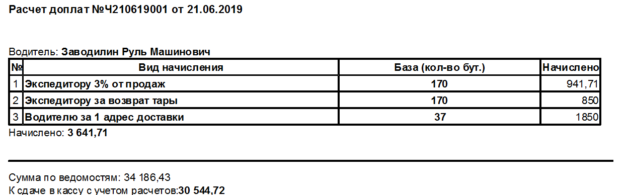 В приведенном примере водителю начислен 3641 руб. 71 коп., а сумма по двум ведомостям 34186 руб. 43 коп. Фактически водитель должен сдать 30544 руб. 72 коп.