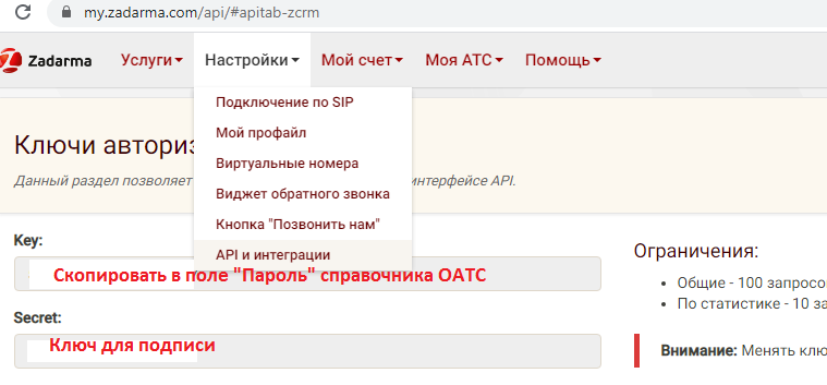 На рисунке выделены поля, куда надо скопировать ключи из личного кабинета (параметр key в поле «Пароль (токен) в АТС», параметр «secret» - в поле «Ключ для подписи» ).