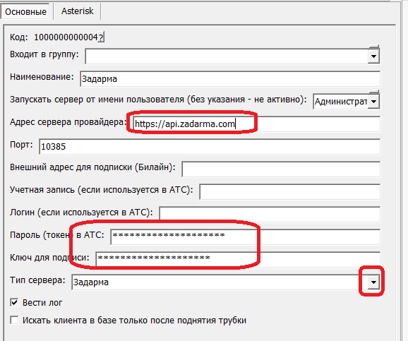 В поле «адрес сервера провайдера» указываем https://api.zadarma.com