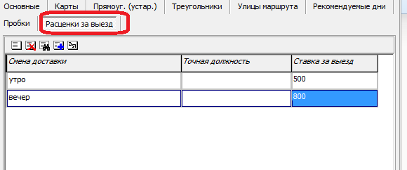 В случае, если за выезд выплачиваются разные суммы в зависимости от смены доставки и точной должности, ставку надо задавать иначе, через табличную часть «Расценки за выезд»: