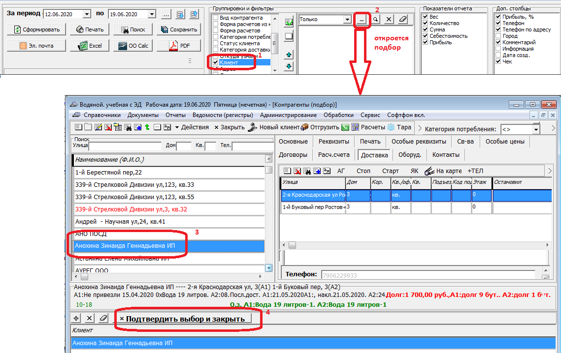 и в открывшемся окне подбора добавляем одного или несколько клиентов в нижний список, затем подтверждаем установку фильтра.