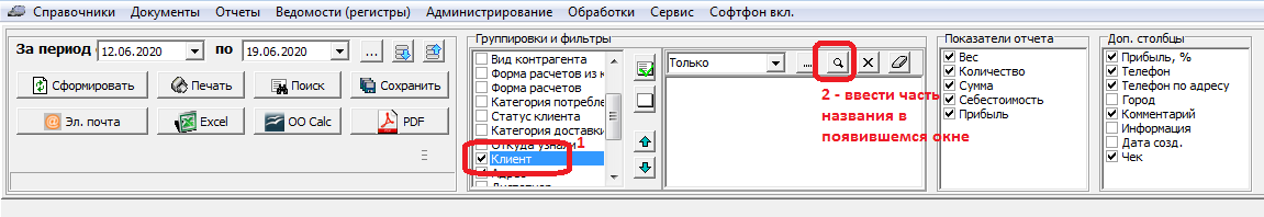 Сначала щелкаем по группировке (например «клиент»), при этом «галочку» ставить не надо (если отметить ее, то в отчете будут строки по этой группировке).