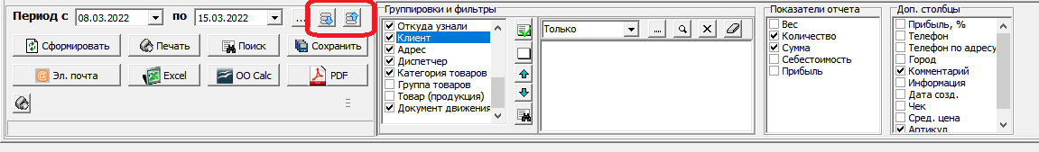 Чтобы не выбирать нужные группировки и показатели при каждом открытии отчета, а также сохранить фильтры по группировкам для повторного использования, предусмотрено сохранение и восстановление настроек.