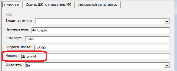 Для фискальных регистраторов с драйвером разработки Штрих-М в поле “модель” должно быть указано “Штрих-М” (именно в таком регистре букв).