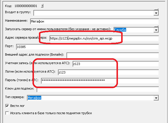 Создаем строку в справочнике «администрирование — облачные АТС», указываем в ней адрес HTTPS виртуальной АТС, например, https://z123.megapbx.ru/sys/crm_api.wcgp, а также пароль для доступа к ВАТС, установленный в личном кабинете. В поле «учетная запись» укажите ключ для доступа к Водяному со стороны АТС (см. рисунок в предыдущем параграфе).
