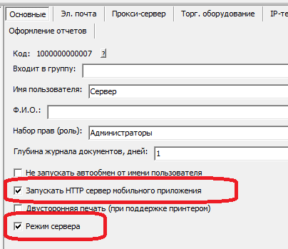 В меню «администрирование — пользователи» добавьте пользователя, например «Сервер» со следующими настройками: