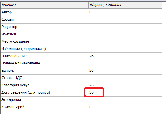 Предположим, в справочнике услуг необходимо добавить в список поле «доп. сведения (для прайса)». Укажем для него ширину 30
