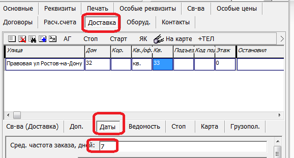 По умолчанию предполагается, что контакт с клиентом (или доставка без звонка) должен происходить каждую неделю, но можно сделать доставку реже (четность номера недели в году можно увидеть в правом нижнем углу основного окна программы, под рабочей датой).