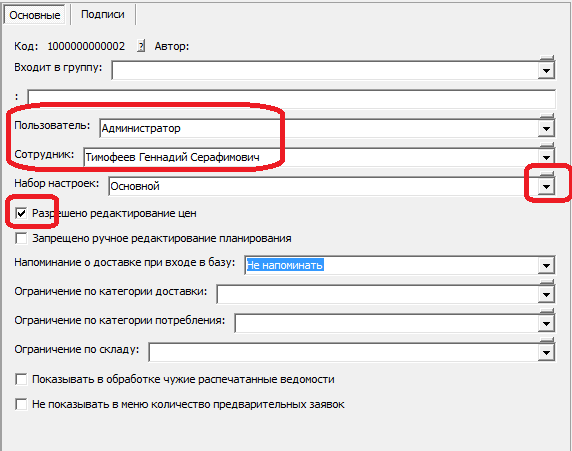 В ней указываем пользователя, сотрудника, как правило разрешаем редактировать цены.