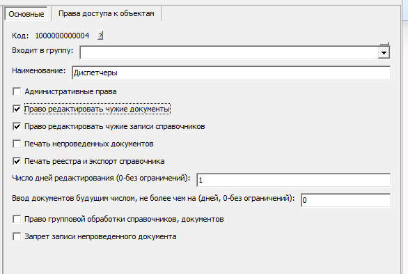 Насколько ранние документы может изменять пользователь, зависит от поля «Число дней редактирования (0-без ограничений)». Соответственно, 1 разрешает редактировать только сегодняшние документы, 2- вчерашние и сегодняшние и т.д. Если есть необходимость вовсе запретить редактирование определенного типа документов, это делается на вкладке «Права доступа к объектам».