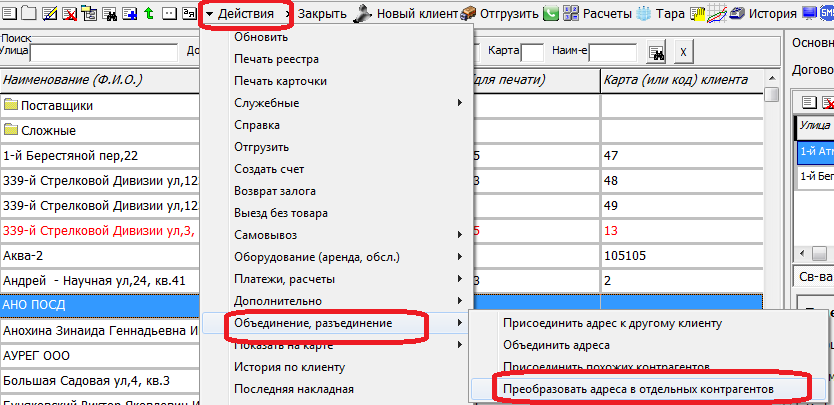 Встав на строку нужного клиента, выбираем соответствующий пункт меню «действия».