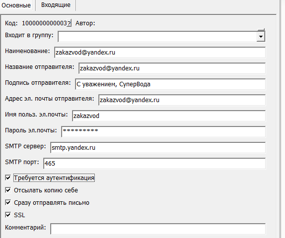 Логин/пароль ящика должны быть внесены в справочник структура компании - учетные записи эл. почты. Флажок «включать в обработку приема входящих писем» НЕ НАДО включать, если это не специальный ящик для приема заказов с сайта, который для рассылок использовать не стоит.