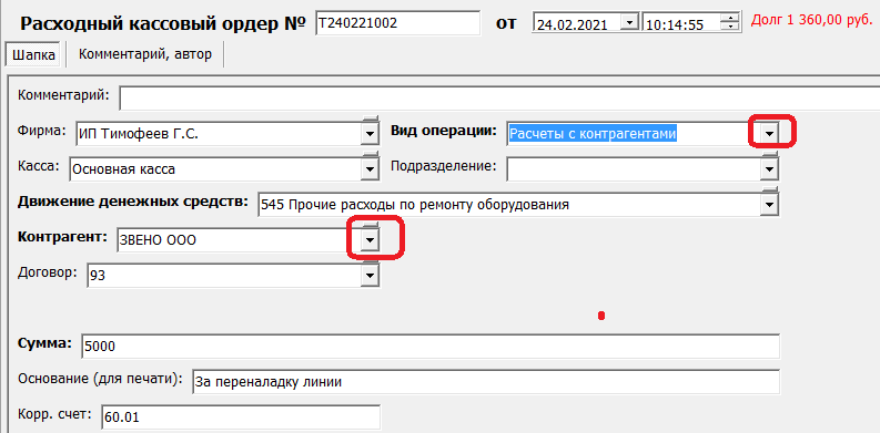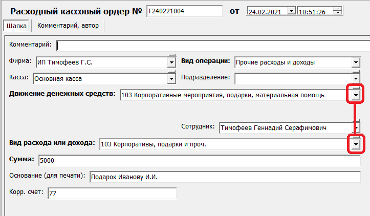 Вид операции «прочие расходы и доходы» используем, когда деньги из кассы сразу тратятся без взаиморасчетов с поставщиками или сотрудниками.