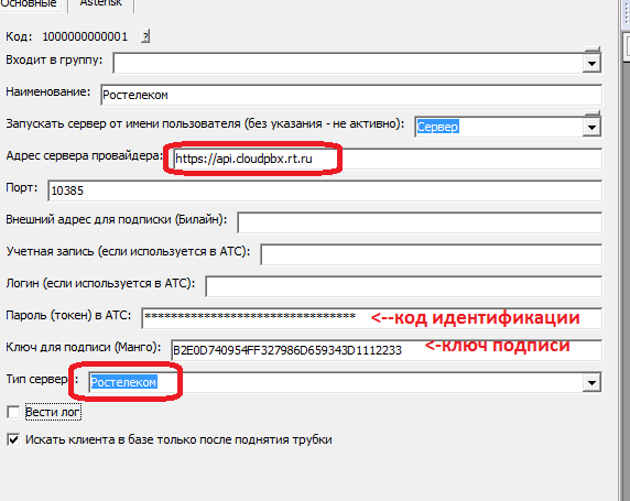 В поле «адрес сервера провайдера» указываем https://api.cloudpbx.rt.ru