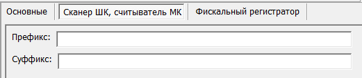 На вкладке «сканер ШК, считыватель МК» можно задать префикс и суффикс кода, настроенный в сканере, как правило необходимости в этом нет (кроме случая, когда при пробном считывании ОДНОМЕРНОГО кода до и/или после цифр обнаруживаются посторонние символы, это как раз и есть префикс и суффикс)