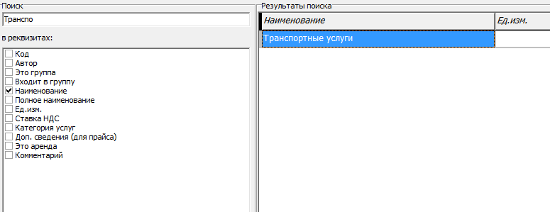 Отмечая в левой части нужные реквизиты, указываем, что искать нужно не только по наименованию. Кроме того, поиск идет по всем названию, а не только по первым символам, как при простом наборе наименования в списке.