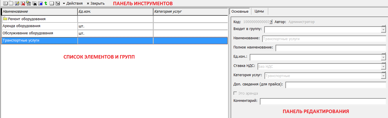 На панели редактирования у любого элемента любого справочника есть, как минимум уникальный код записи, назначаемый автоматически (по порядку), автор, наименование и поле «входит в группу».