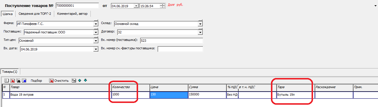 В программе предусмотрен регистр «Тара поставщиков». По нему мы можем отследить, сколько тары получено от поставщика (в составе товара) и сколько пустых бутылей ему возвращено.