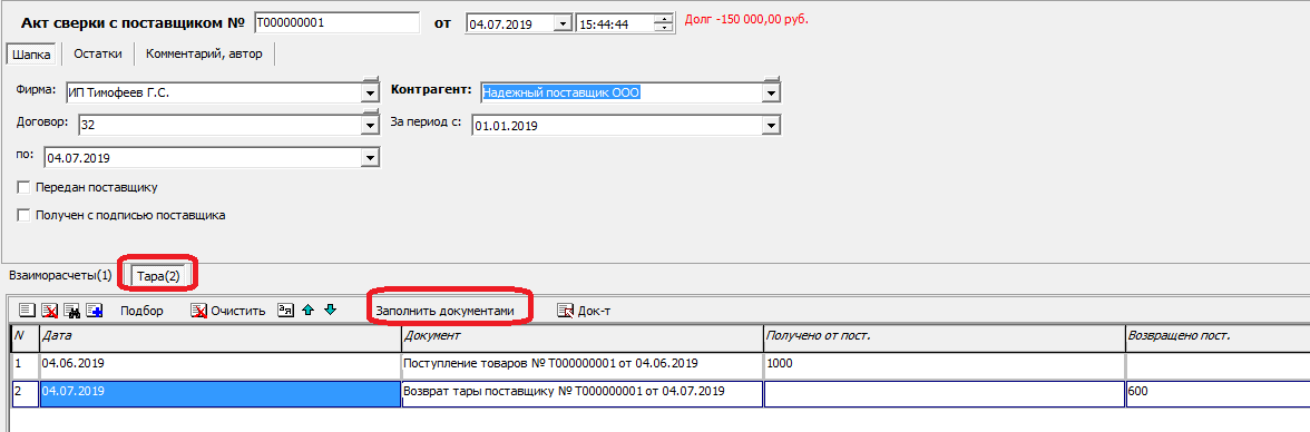 По нажатию кнопки «заполнить документами» в него попадут документы взаиморасчетов и, в таблицу на второй вкладке - движения тары.