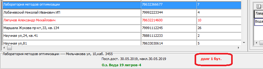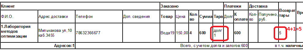 У клиента из первой строки указано количество в столбце возврата тары, т.к. это не первая доставка (либо у клиента были собственные бутыли).