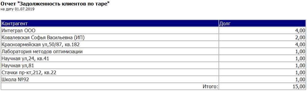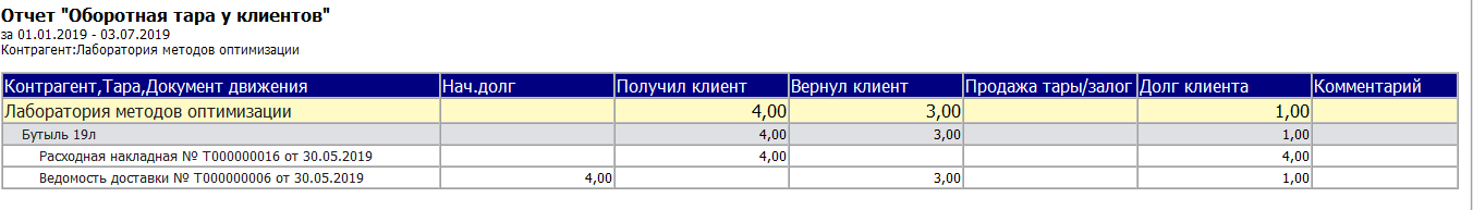 Однако на практике удобнее использовать отчет «Задолженность клиентов по таре» из того же меню. В нем будет показаны только клиенты, имеющие долг по таре.