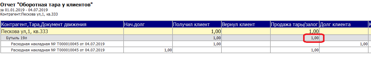 Во второй строке столбец возврата пуст, зато заполнено поле «пр. тара» - в нем 300 рублей, причитающиеся с клиента за бутыль.