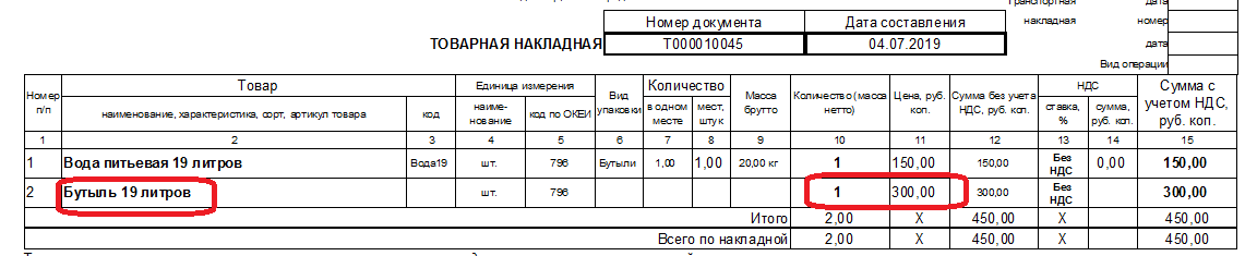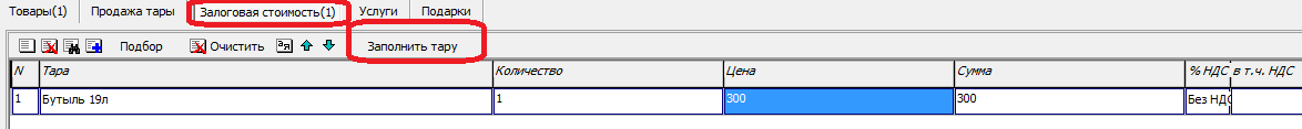 Появится строка тары с количеством, соответствующее количеству воды и ценой, указанной в справочнике «оборотная тара».
