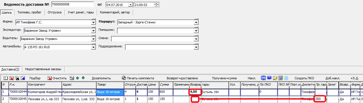 От клиента требуется лишь заплатить за тару. В ведомости доставки в данном случае отражаем фактически полученную сумму, а возврат тары оставляем пустым, т.к. бутыли клиент не возвращал.