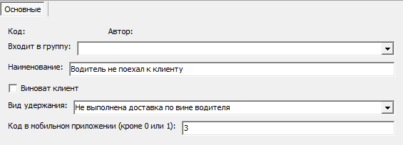 Если виноват клиент, ставится соотв. отметка, вид удержания не заполняется (как и в случае других проблем, не зависящих от водителя). Код в мобильном приложении должен соответствовать настройкам мобильного сайта.