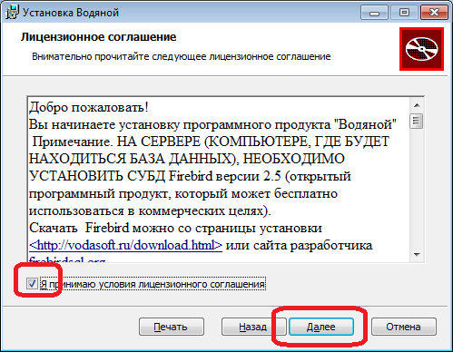 До инсталляции Водяного установите систему управления базами данных Firebird. На дополнительных рабочих местах это не требуется.