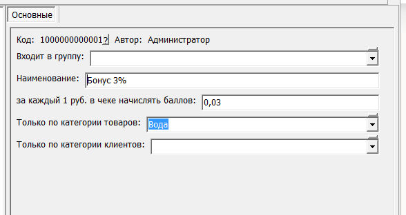 Можно указать категории товаров и клиентов, для которых действует правило, если не заполнять, то бонус будет начислен за любую покупку любому клиенту.