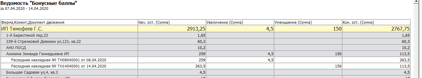 В меню «ведомости, регистры» можно сформировать отчет «бонусные баллы»: