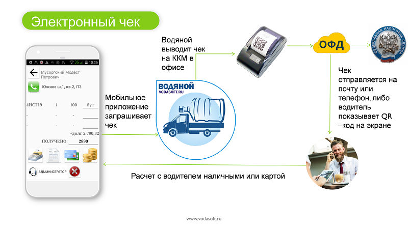 водитель нажимает кнопку в приложении → мобильное приложение запрашивает чек у Водяного → Водяной выбивает чек на офисной ККМ, получает от кассы данные для формирования QR-кода и отправляет их мобильному приложению → ККМ передает данные ОФД → Чек приходит на почту или телефон от оператора фискальных данных.