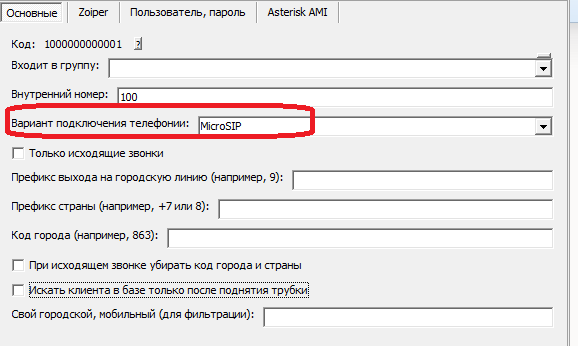 3) выберите в поле «вариант подключения телефонии» значение «MicroSIP».