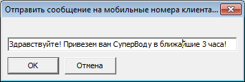 из документа «ведомость доставки». Будет предложено отправить на все мобильные номера клиентов, входящих в документ одинаковый текст. Шаблон также можно задать в значениях по умолчанию